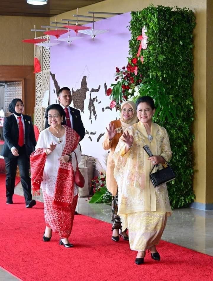 Sementara itu, Ibu Iriana tampil anggun dengan mengenakan kebaya berwarna kuning. Ibu Iriana turut menyempurnakan penampilannya dengan kain dan selendang berwarna senada.