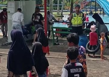 Ciamis, Jabar – Polsek Cipaku Polres Ciamis Polda Jabar melaksanakan pengamanan di kawasan obyek wisata Waterbom Tirta Sumber Jaya, Desa Jalatrang, Kecamatan Cipaku, Kabupaten Ciamis, Jawa Barat, Minggu (22/01/2023).