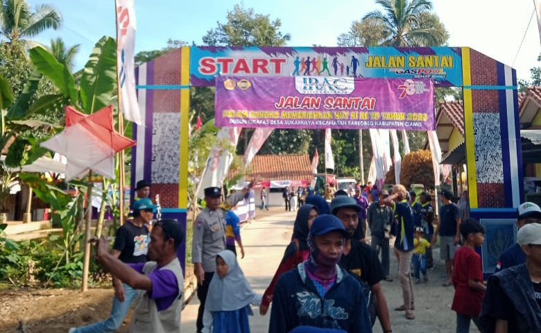 Ciamis, Jabar ~ Polsek Ciamis Polres Ciamis Polda Jabar melaksanakan monitoring kegiatan Jalan Santai dalam rangka memperingati HUT kemerdekaan RI yang ke 78. Kegiatan tersebut dilaksanakan di Dusun Cikapas, Desa Sukamulya, Kecamatan Baregbeg, Kabupaten Ciamis, Jawa Barat, Minggu (3/9/2023).