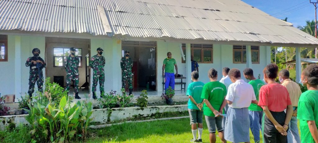 Mediacyberbhayangkara.com – Keerom – Satgas Pamtas RI-PNG Yonif 711/Rks Pos Ujung Karang membantu sebagai Tenaga Pendidik (Gadik) mengajar olahraga di SMA YPK Yetti Kampung Pikere, Distrik Arso Timur, Kabupaten Keerom, Papua, Rabu (18/5/2022).