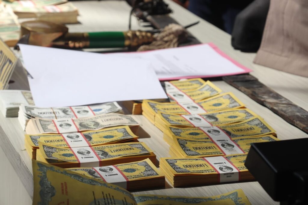 Total barang bukti yang di amankan untuk tersangka S diantaranya 1200 lembar uang pecahan 1 juta Usa dolar, jika di kurs kan setara dengan 18 triliun. 100 lembar uang pecahan 1000 dats, jika di kurs kan yaitu 800 juta kemudian 2 lembar sertifikat word, dan 12 lembar sertifikat LAC.
