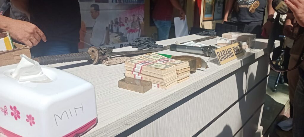 Kemudian bersama dengan barang bukti didapatkan beberapa alat bukti yang digunakan tersangka T, dengan memberikan iming-iming untuk menyakinkan calon pembeli dengan peralatan benda yang dinilai benda keramat yaitu sebilah pedang, samurai gulung yang bisa potong paku, kuningan tertulis kan gold.