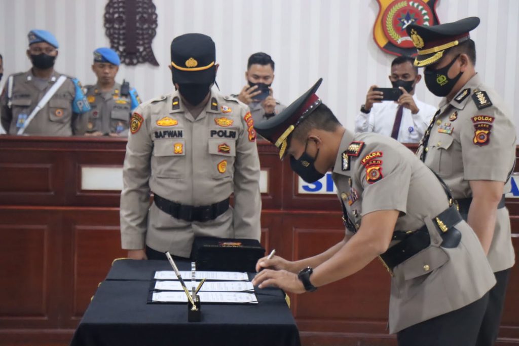 Mediacyberbhayangkara.com – Banda Aceh – Kapolda Aceh Irjen Ahmad Haydar menjadi Inspektur Upacara (Irup) serah terima jabatan (sertijab) dua PJU dqn lima Kapolres yang mutasi, Senin, 4 Juli 2022, di Lobi Mapolda Aceh.