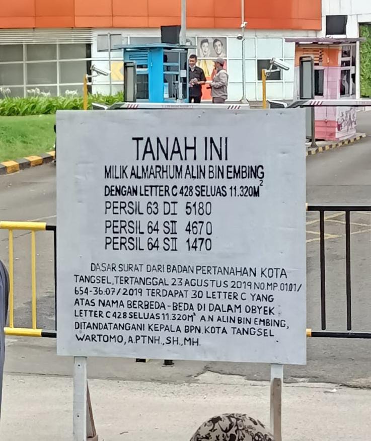 “kami sampaikan untuk melakukan kegiatan pada hari ini Kamis 27 Januari 2022, kegiatan aksi damai karena adanya penyerobotan lahan di tanah letter C. No. 428 atas nama Alin Bin Embing, dengan tujuan agar tanah milik Elin Bin Embang di kembalikan atau ganti rugi yang selama ini di bangun bangunan Bintaro Jaya Exchange Mall diatas tanah seluas 11.320m2. “Jelasnya.