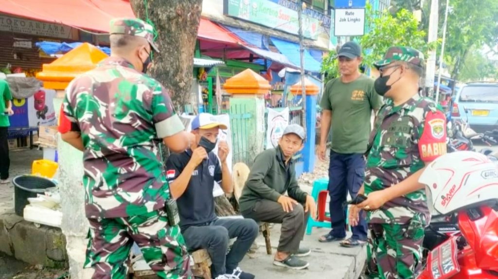 mediacyberbhayangkara.com – Kodam Jaya – Jakarta Barat – Babinsa Koramil 03/GP – Kodim 0503/JB Serda Atep Sutisna dan Serda Yan Sofyan membagikan masker dalam rangka mendukung Instruksi Mendagri No.09 Tahun 2022 guna monitoring PPKM di Pasar Slipi dan Mall Slipi Jaya, Kelurahan Kemanggisan, Kecamatan Palmerah, Jakarta Barat, Senin Pagi (10/10/2022).