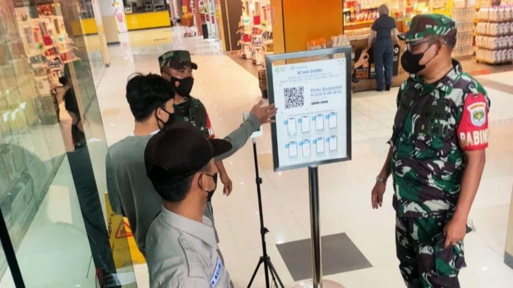 “Selalu pakai masker saat beraktivitas dan vaksin booster ya pak. Jangan lupa cek suhu tubuh dan scan Peduli Lindungi saat memasuki Mall”, tegas Babinsa Koramil 03/GP Serda Atep Sutisna kepada salah satu pengunjung Mall Slipi Jaya.