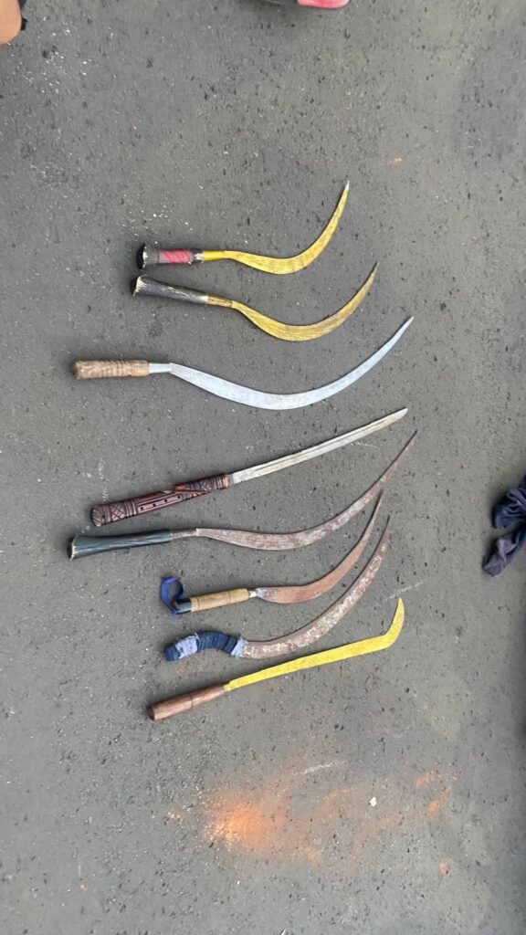 ” Kami juga turut mengamankan berbagai senjata tajam maupun senjata tumpul diantaranya 8 buah sajam (6 buah celurit, 1 pedang dan 1 buah corbek), 5 buah senjata tumpul maupun 4 buah petasan yang sudah terpakai,” terang Agung