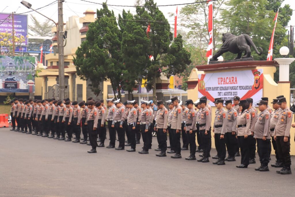 Ciamis, Jabar – Polres Ciamis Polda Jawa Barat melaksanakan upacara korps raport kenaikan pangkat pengabdian anggota Polri satu tingkat lebih tinggi. Kegiatan tersebut digelar di halaman Mapolres Ciamis Jalan Jend. Sudirman No.271, Sindangrasa, Kecamatan Ciamis, Kabupaten Ciamis, Jawa Barat, Rabu (2/8/2023).