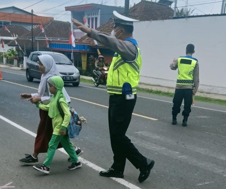 Ciamis, Jabar – Polsek Cikoneng Polres Ciamis Polda Jabar melaksanakan giat strong point pagi/pengaturan arus lalu lintas dengan sasaran anak sekolah pada Selasa, (22/8/2023).