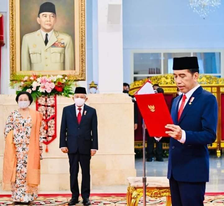“Saya bersumpah bahwa saya akan setia kepada Negara Kesatuan Republik Indonesia yang berdasarkan Pancasila dan Undang-Undang Dasar Negara Republik Indonesia Tahun 1945 serta akan menjalankan segala peraturan perundang-undangan dengan selurus-lurusnya demi darmabakti saya kepada bangsa dan negara,” ujar Presiden mendiktekan penggalan sumpah jabatan.
