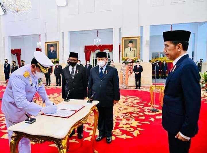 mediacyberbhayangkara.com – Jakarta – Presiden Joko Widodo melantik dan mengambil sumpah jabatan Laksamana TNI Yudo Margono sebagai Panglima Tentara Nasional Indonesia (TNI), pada Senin, 19 Desember 2022. Acara pelantikan berlangsung di Istana Negara, Jakarta, dengan menerapkan protokol kesehatan.