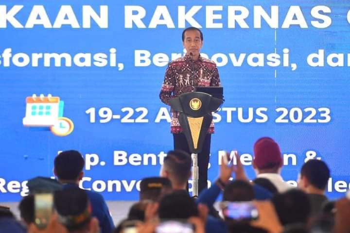 MEDAN — Presiden Joko Widodo menghadiri pengukuhan kepengurusan dewan pimpinan pusat (DPP) dan peresmian pembukaan rapat kerja nasional (rakernas) Gerakan Angkatan Muda Kristen Indonesia (GAMKI) Tahun 2023 di Lapangan Banteng, Kota Medan, Provinsi Sumatra Utara, pada Sabtu, 19 Agustus 2023. Dalam sambutannya, Presiden menekankan pentingnya menjaga persatuan dan kekompakan di tahun politik yang mulai menghangat.