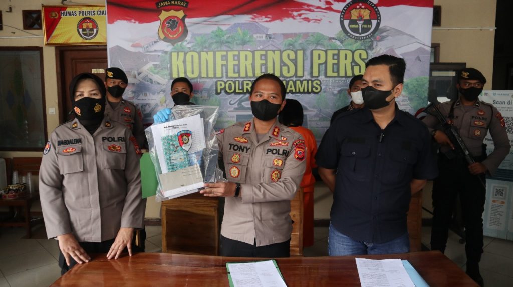 “Kasus penipuan dan/atau penggelapan di wilayah Banjarsari, kami amankan NR (30) sebagai tersangka utama sejak tanggal 2 Agustus 2022,” kata Kapolres Ciamis AKBP Tony Prasetyo Yudhangkoro, SH., S.I.K., M.T., didampingi Kasat Reskrim Polres Ciamis AKP Muhammad Firmansyah, S.I.K., dan Kasi Humas Polres Ciamis Iptu Magdalena NEB dalam konferensi pers di depan ruang Humas Polres Ciamis, Jumat (12/8/2022).
