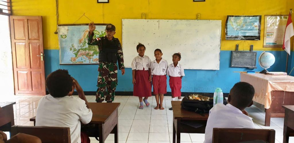 Mediacyberbhayangkara.com – Merauke – untuk menumbuhkan kecintaan siswa sekolah kepada bangsa Indonesia, Satgas Pamtas Yonif 511/DY Pos Kalimaro yang dipimpin oleh Serda Inal berserta 10 personel mengajarkan lagu-lagu Nasional kepada siswa bertempat di Yayasan Pendidikan Kristen (YPK) SD YPK Tanas di Kampung Tanas, Distrik Elikobel, Kabupaten Merauke. Selasa (14/02/2023).